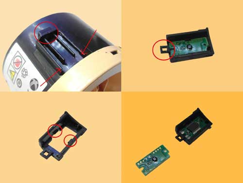 Планку с чипом снимайте постепенно, с одной стороны приподнимите край планки со стороны бежевой крышки картриджа.