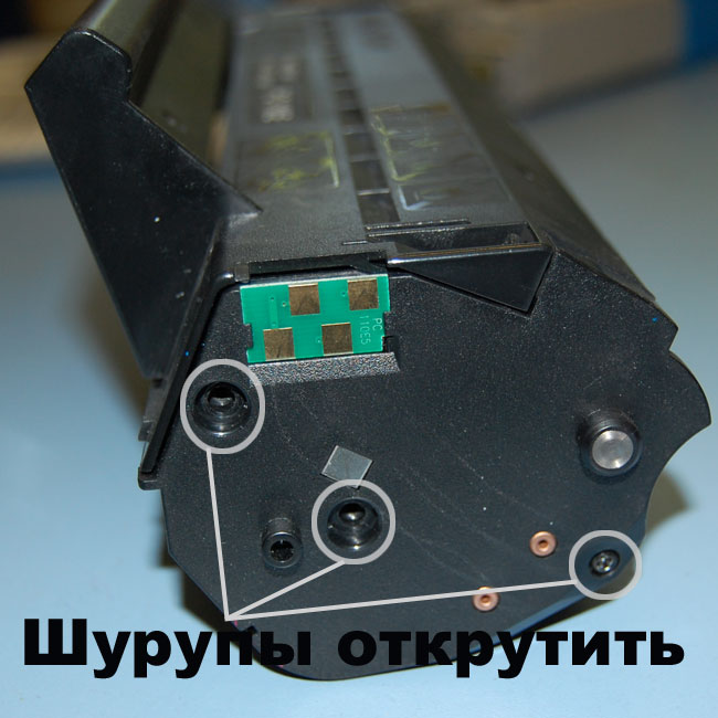 С торца картриджа со стороны чипа откручиваем три фиксирующих шурупа и снимаем боковину. Дальше все просто – открываем пробку и засыпаем тонер. Кстати, в отличии от картриджей Samsung, в картриджах Pantum пробка сделана из мягкого пластика и легко извлекается. В картридж помещается около 120гр. тонера. В картридж можно засыпать не только тонер, идущий в комплекте с набором, но и любой другой от монохромных принтеров Samsung.